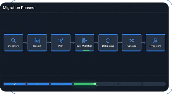 Solution architects, project managers, and cutover engineers aligned to your team.
