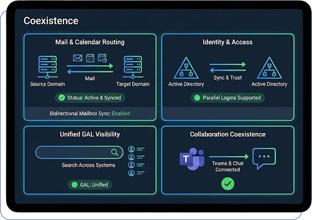 Mail routing, calendar free/busy sharing, shared address books, and Teams/Chat coexistence keep users connected while domains transition.